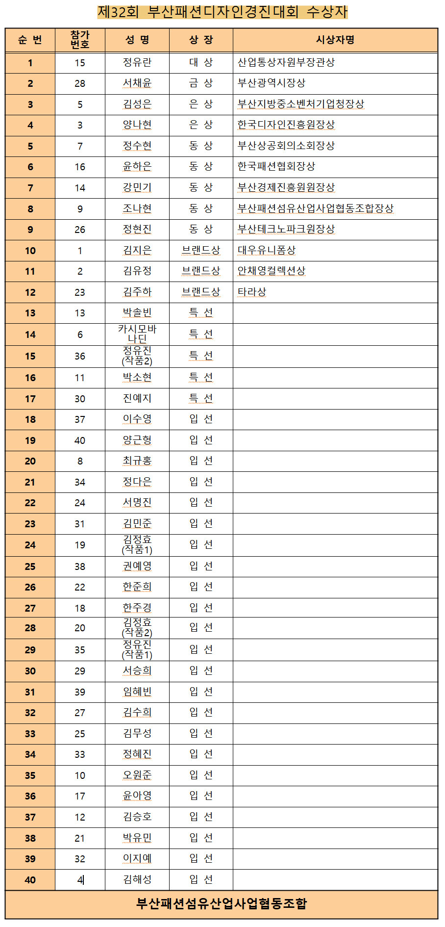 Á¦32ȸ ºÎ»êÆÐ¼ÇµðÀÚÀΰæÁø´ëȸ ¼ö»óÀÚ [ºÎ»êÆÐ¼Ç¼¶À¯»ê¾÷»ç¾÷Çùµ¿Á¶ÇÕ]